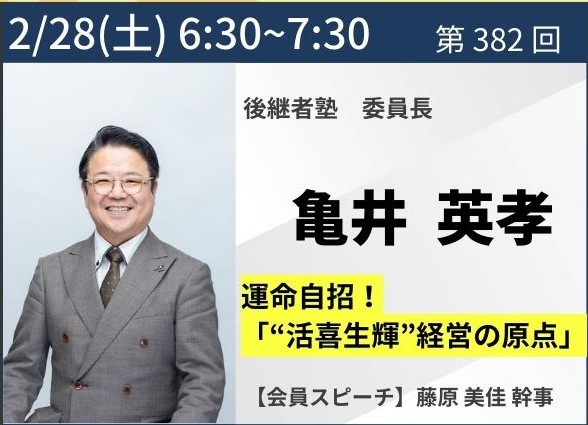 最新行事予定EVENT DETAILS トップ > 最新行事予定一覧 > 2026年2月28日 経営者モーニングセミナー 2026年2月28日 経営者モーニングセミナー 後継者塾 委員長 亀井 英孝 氏 運命自招! 「”活喜生輝”経営の原点」 ※画像が表示されるまで、少しお時間がかかります。 2月のチラシ – 1